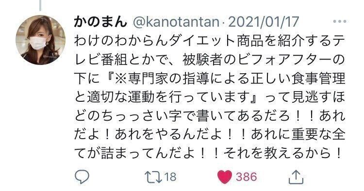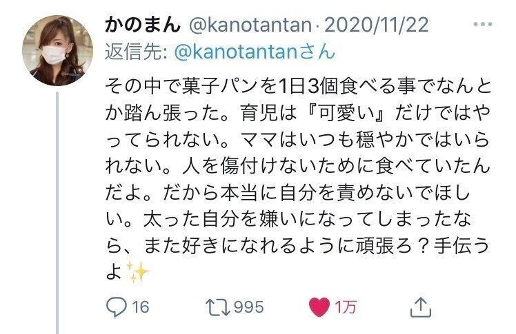 1984年生まれ。2017年に出産した、3才の男の子がいるママで、普段は歯科衛生士として働く。2020年3月、ツイッターで自身のダイエットのビフォー&アフター写真を公開し、話題に。現在は、ツイッターやnoteを通じて「ハッピーにやせて、超ハッピーになる」ための情報を発信。21年1月に自身初の書籍『人生が変わる!かのまん整形級ダイエット』を発表。
