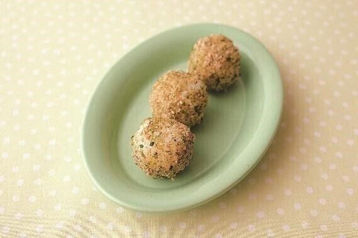 (2) ごはんを15等分にしてそれぞれラップで茶巾状に包んで、(1)をまぶす。