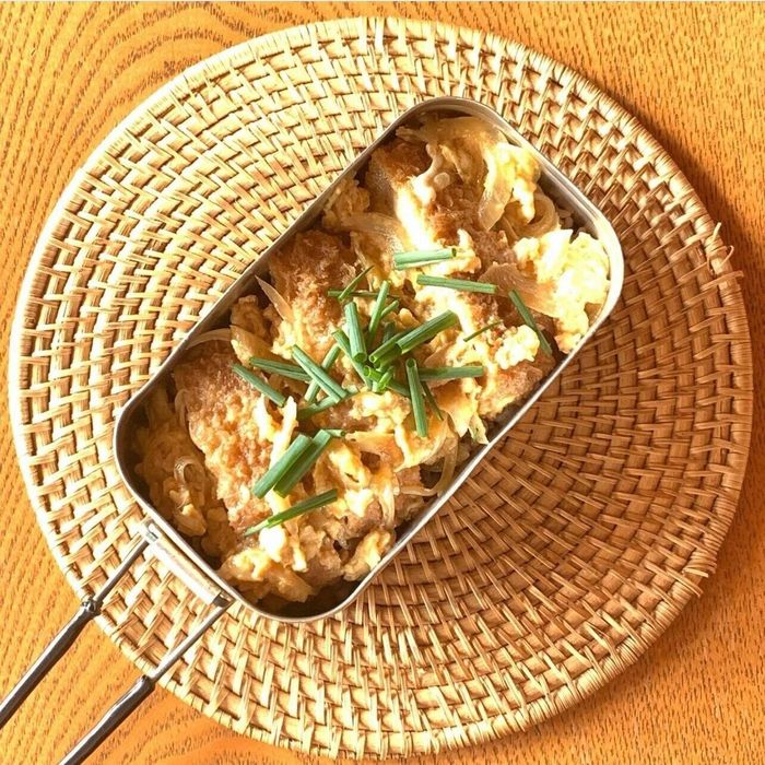 nozomi.yさんはカツ丼を作ったそうです。メスティンで白いご飯を炊いてから蓋でカツ煮を作れば、立派なカツ丼ができあがりますね!この方法ならいろいろな丼ものに応用できるかも。