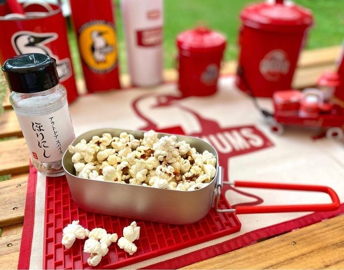 きゃすバルさんがメスティンで作ったのはポップコーン。ポップコーン豆とバター、塩、お気に入りのアウトドアスパイスで作れたそう。メスティンのハンドルは赤のシリコンホースを使って、自分好みにカスタマイズしたみたいですよ。