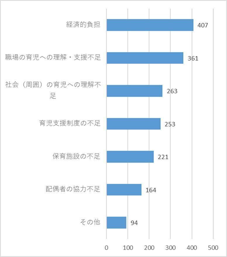 なお、「出産・育児をしにくい」と思う理由の1位は「経済的負担」で、「職場や社会の子育てへの理解支援不足」「保育園不足」「配偶者の協力不足」と続きます。