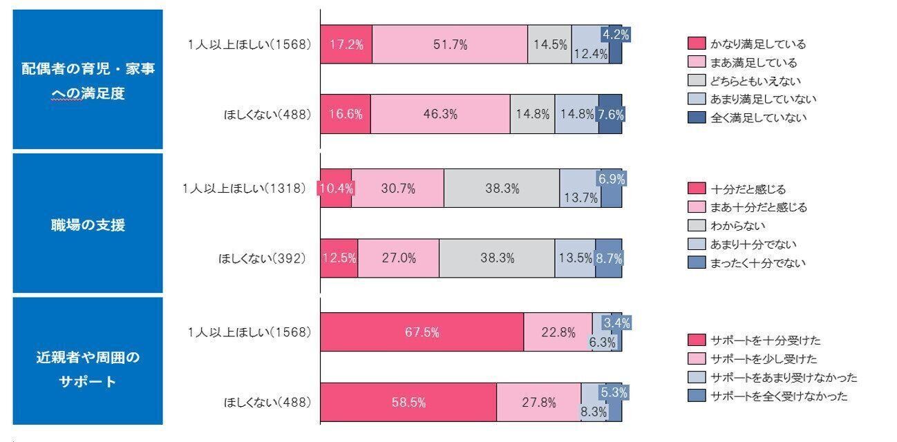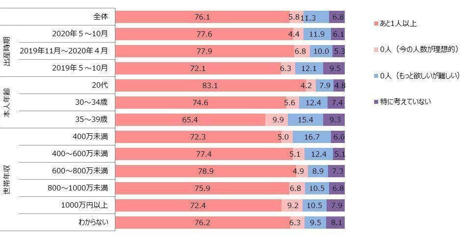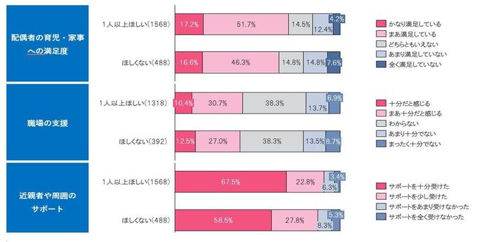 子どもをもう1人以上ほしいと考えるママも76.1%と多く、配偶者や周囲の支援に満足している人ほど、その傾向が強くみられました。