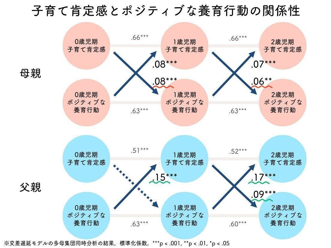 また、この「子育てに対する感情」と「ポジティブあるいはネガティブな養育行動」には双方向的な関係性があることも明らかになりました。とくに父親は、0歳児期のポジティブな養育行動が1歳児期の子育て肯定感と、1歳児期のポジティブな養育行動が2歳児期の子育て肯定感と関連しています。