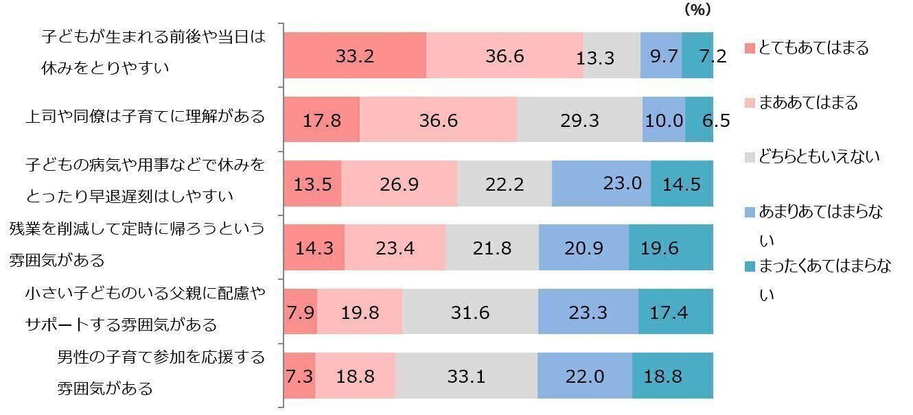 「配偶者の職場が、男性の育児などについてどのくらい理解があるか」という質問に対しては、「上司や同僚は子育てに理解がある(54.3%)」けれど、実際には「子どもの病気や用事などで休みをとったり早退遅刻」するのは難しく、男性の育児参加を応援する雰囲気もまだまだ少ないのが現状のよう。