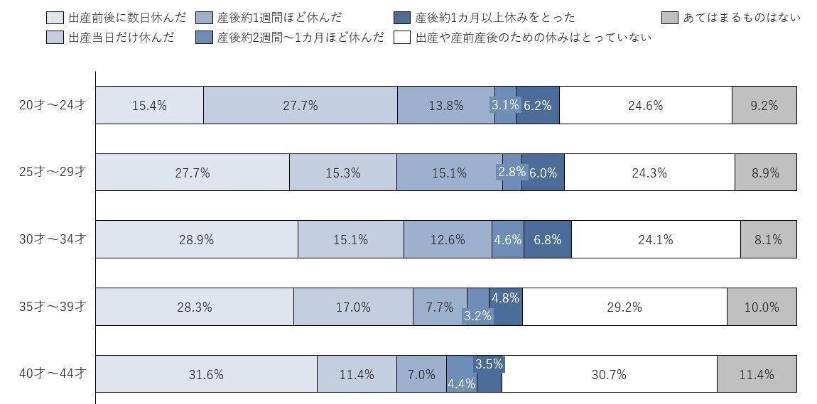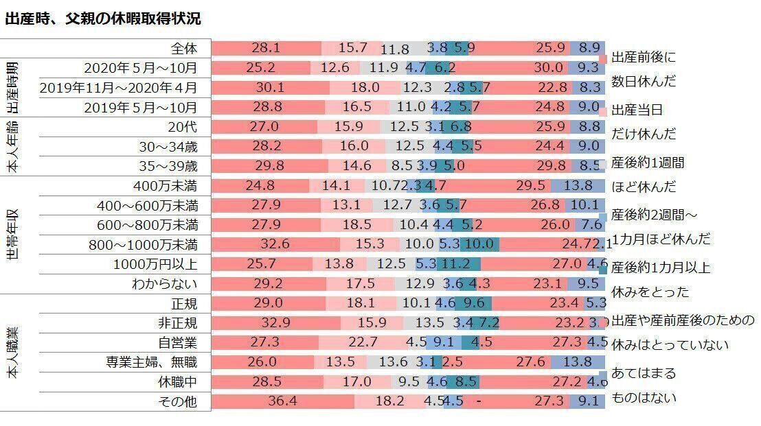 一方で、休みを取らなかった人も25.9%おり、4人に1人は休みをとっていない現状がうかがえます。2020年5月の緊急事態宣言解除後に出産した人ほど、配偶者が育休をとっていないケースが多く、コロナ禍により家族が病院に行くことができなかったことが原因と考えられます。