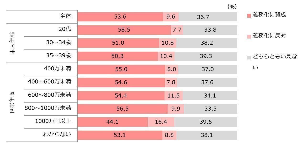 「どちらとも言えない」と答えた人も36.7%と多く、制度に反対ではないけれど、制度そのものの情報が不足していたり、導入による悪影響(収入減少、配偶者の昇進を妨げるなど)に不安を感じている人が多いことがうかがえます。