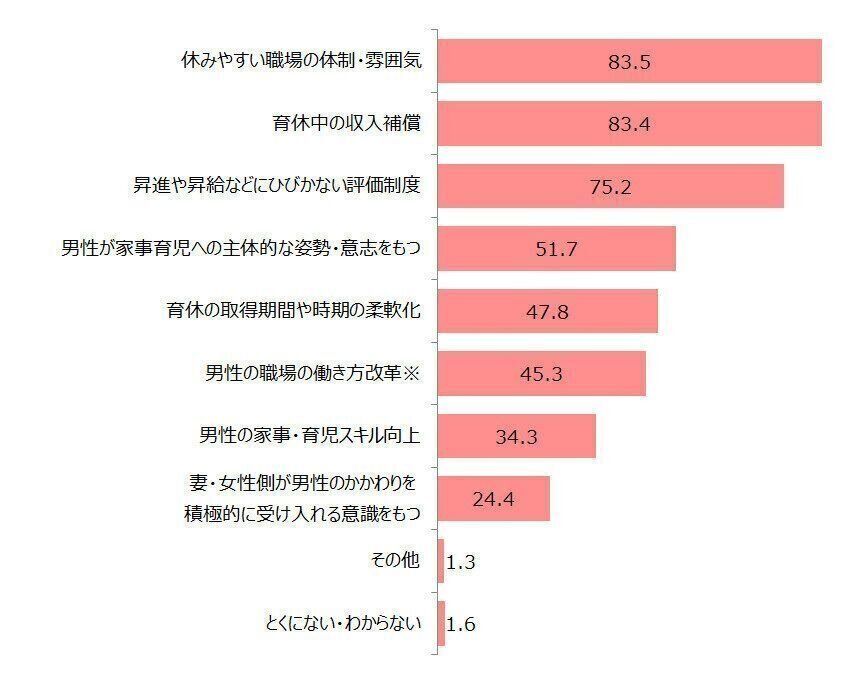 「男性の育休取得に必要なことは?」という質問では、「休みやすい職場の体制・雰囲気づくり」83.5%と、「育休中の収入補償」83.4%がほぼ同率。3位の「昇進や昇給にひびかない評価制度」も75.2%と多く、職場環境の改善を求める声が上位を占めました。