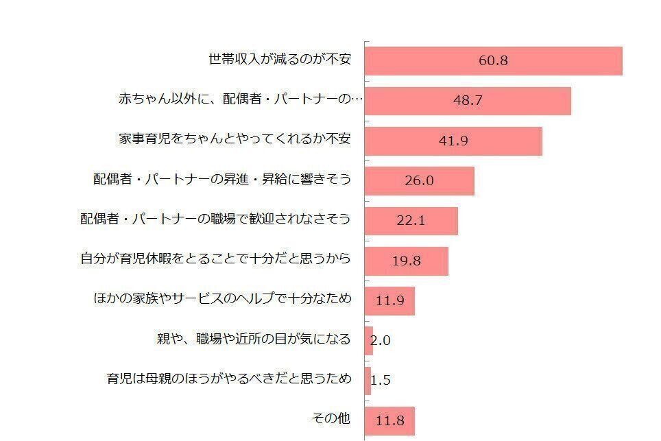一方で、育休制度に「反対」「どちらともいえない」という意見も約5割。理由の1位は「世帯収入が減るのが不安」60.8%でした。次に「配偶者・パートナーの面倒までみることになりそう」48.7%や、「家事育児をちゃんとやってくれるか不安」41.9%が続き、休んだ配偶者の育児参加を疑問視する声も多く聞かれました。現行制度は収入保障がありますが、その内容の周知がされていない可能性が推測されました。