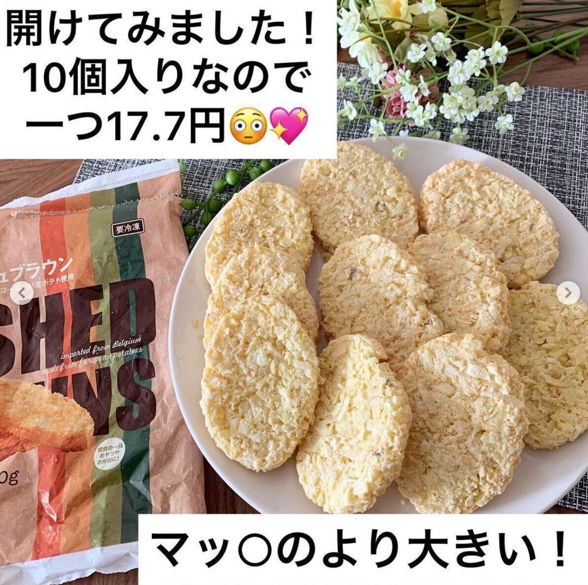 こちらのハッシュブラウンは500gで10個入りだそうで、一つあたり17.7円程で食べられるそうです。ほんのり塩気があるので、味付けをしなくても美味しいそうです。もちこさんは二日連続で朝ごはんに食べたそうです♪