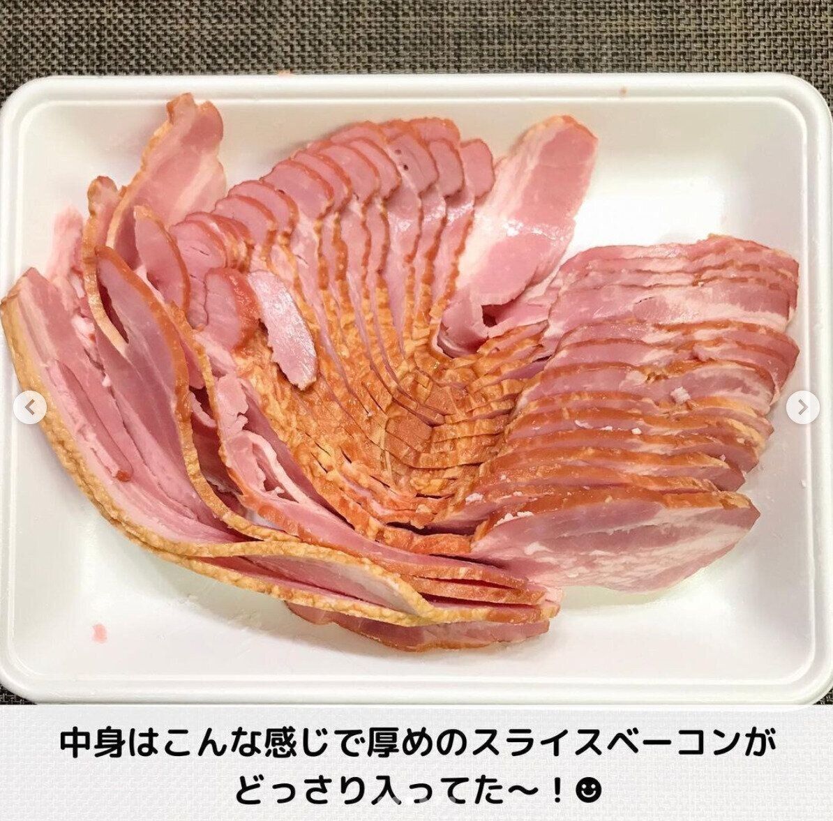 こちらは付け合わせに便利な吊るしベーコンです。厚切りスライスベーコンが700gも入っていてボリュームたっぷりなんだとか!100gあたり97円程でとてもお得だそうで、love_gs_lifeさんは一部を冷凍して保存しているそうです。