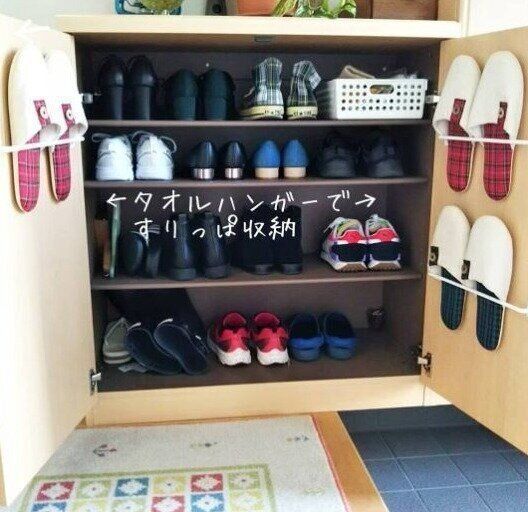 さかたちあきさんはタオルハンガーを靴箱の扉に取り付け、スリッパを収納しています。靴箱の中のスペースも有効活用でき、上手に隠す収納ができていますね。この方法なら玄関もすっきりしそう!