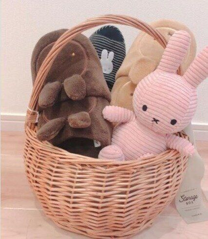 natsumi.oさんはバスケットにミッフィーのスリッパとうさぎのぬいぐるみを一緒に収納しています。ピンクのうさぎのぬいぐるみがアクセントになっていて可愛いですね。