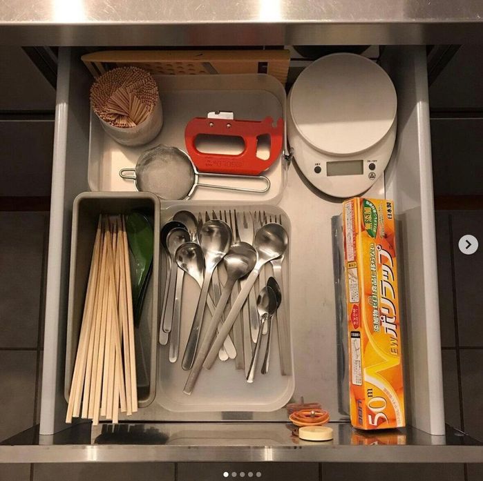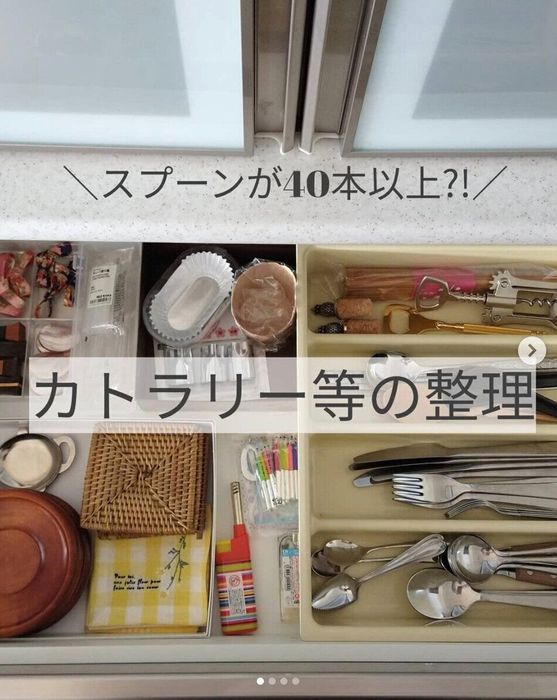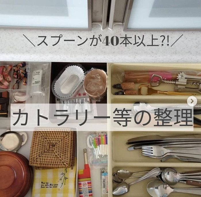 PONさんはずっと気になっていた食器棚のカトラリーを整理することに。いつの間にか増えてしまったカトラリー。スプーンは40本以上も出てきてびっくりしたそうですが、整理して16本まで減らしたそう。これで随分すっきりしそうですね。