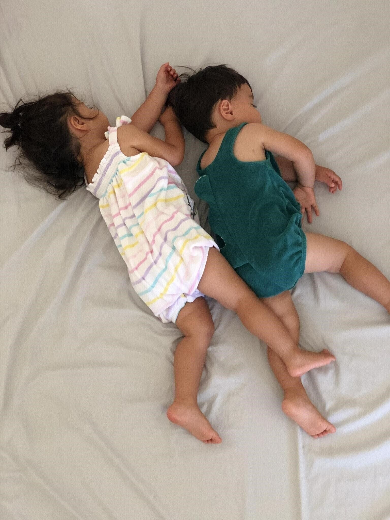 スピーカーをつけると寝る時間だと徐々に認識してきた双子は音が流れ始めると落ち着き、キャッキャッ騒いでいたのもコソコソ話になり、自然とベッドでゆっくりするようになりました。