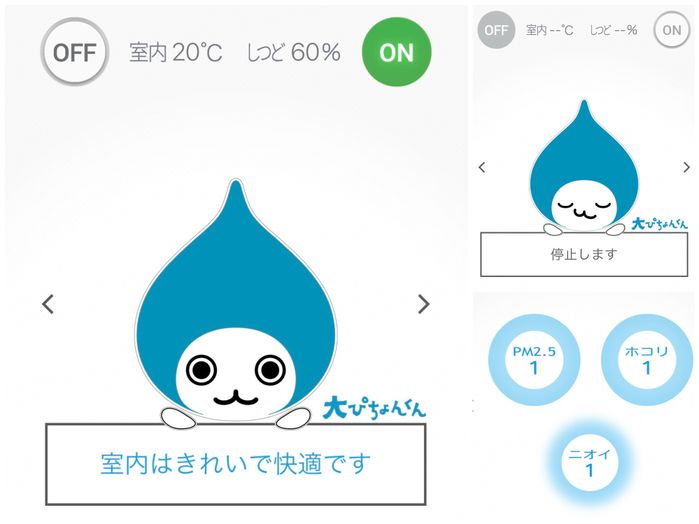 スマートフォン・スマートスピーカーと接続すれば離れた場所や外出先から専用アプリでON/OFFやタイマー設定、風量設定の調整が可能。この遠隔操作ができる機能は、私はあまり使っていませんが、大ぴちょん君の表情で室内の空気状況が分かる点は便利でよく確認します。