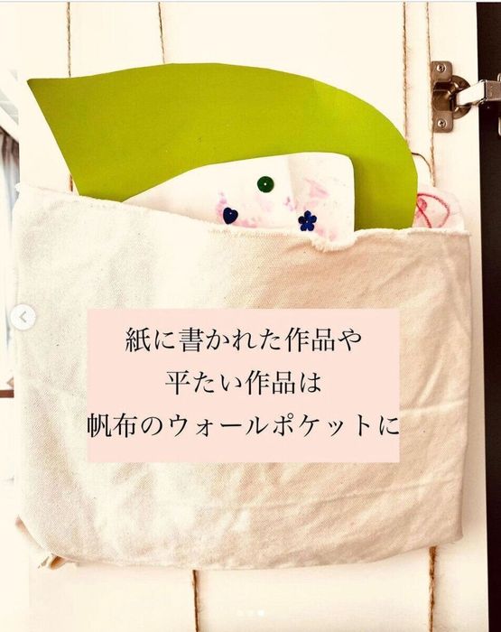 miiさんは作品の種類などによって収納方法を変えているそう。子どもがお気に入りのものは壁に吊るして飾る、平面的な作品は帆布のウォールポケットに、立体的な作品は風呂敷バッグに収納しているのだとか。ゴミを増やさないためにプラケースではなくて布に収納するのがmiiさん流。月に1回中身を出して、子どもと一緒に残すものを決めているそう。