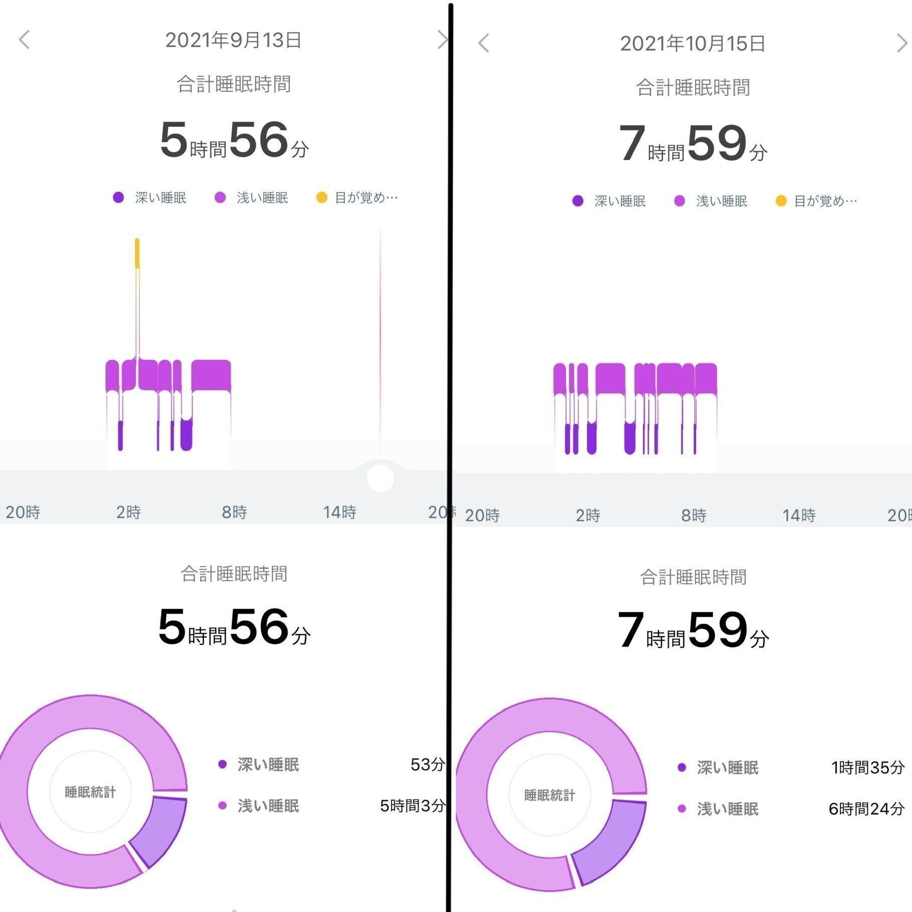 HUAWEI Band 6による睡眠データ。左がエアコン導入前で右が導入後。赤ちゃんの深夜の夜泣きも減りました。 -