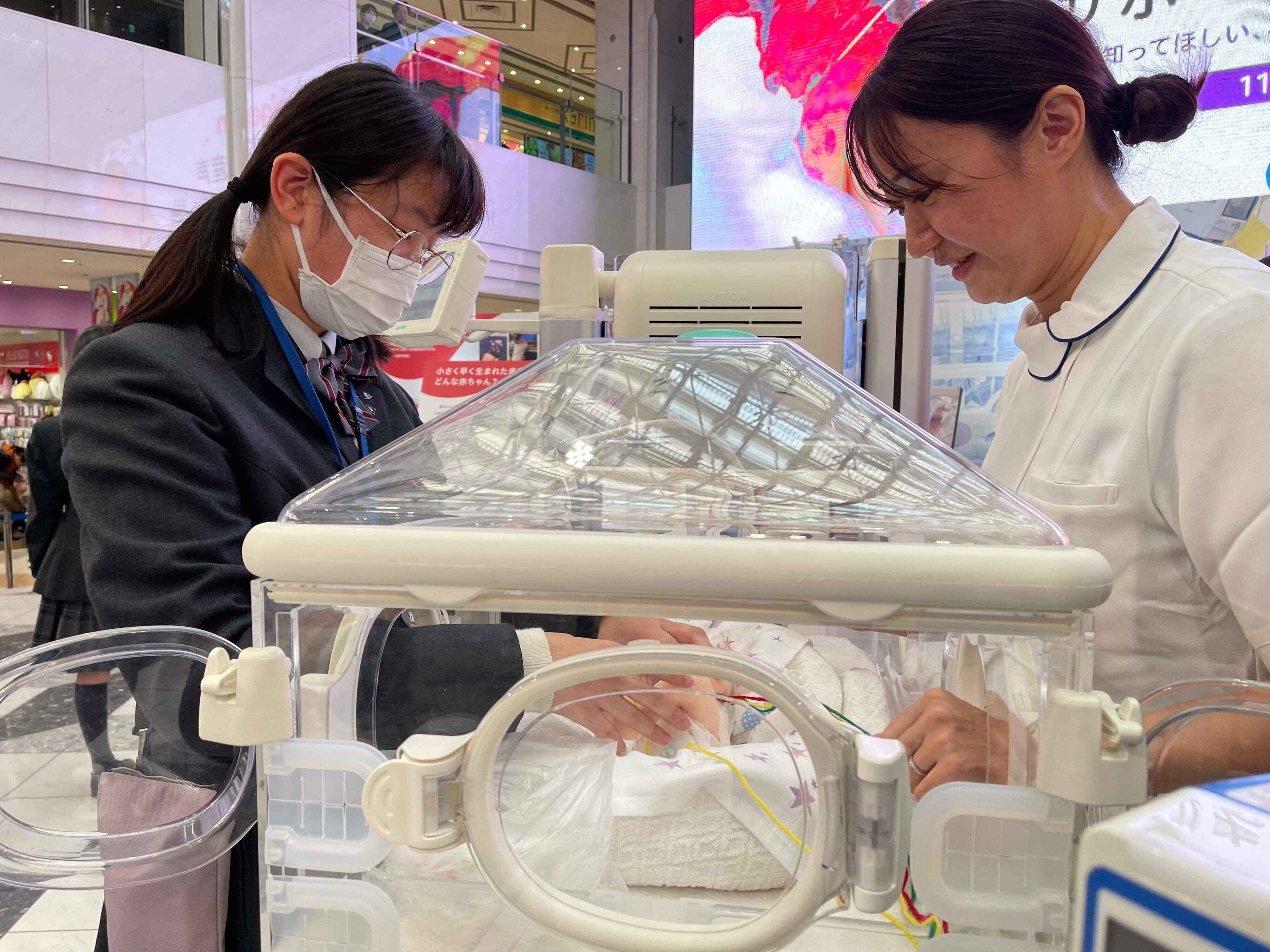 保育器に入った赤ちゃんのおむつ替えを体験する中学生。新生児医療を体感できる。撮影/河合 蘭 -