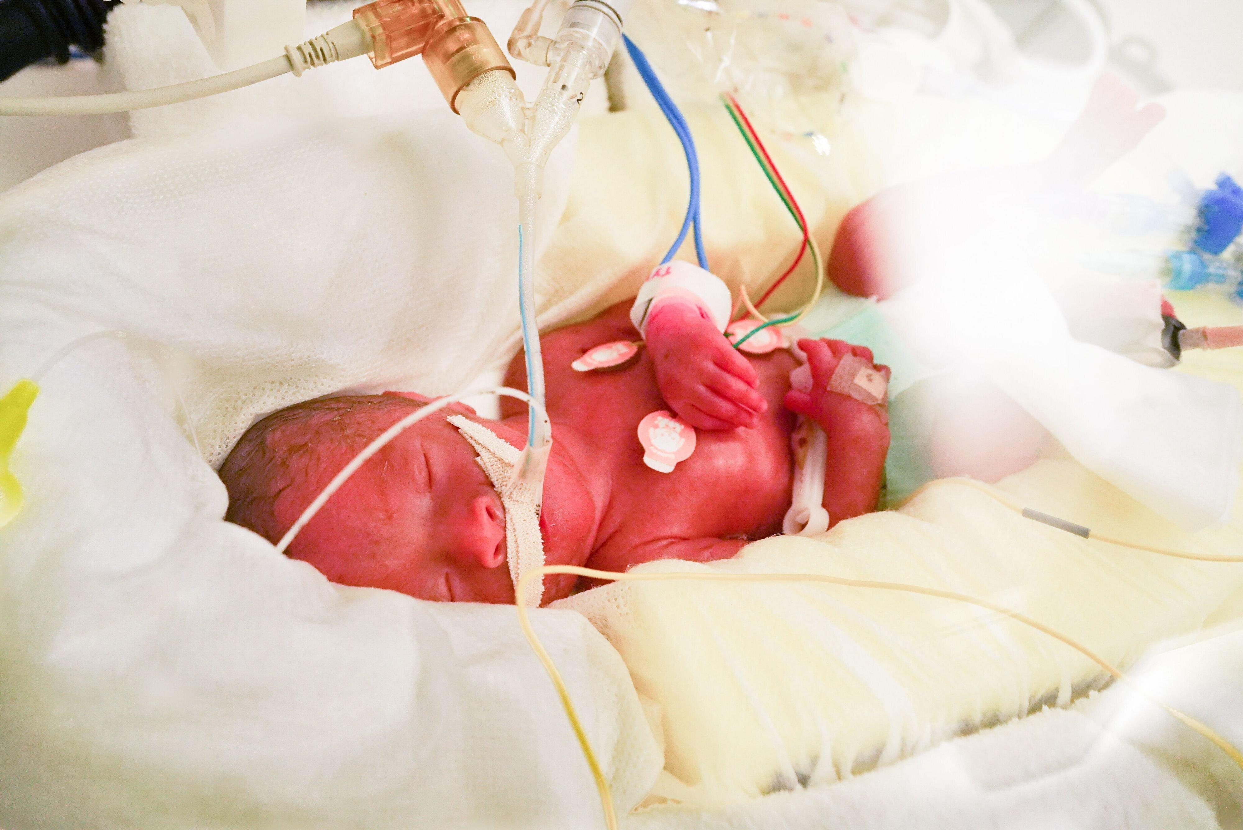 妊娠26週で生まれた赤ちゃん。出産の翌日の撮影で、赤ちゃんは皮膚が透けるように薄く、手のひらにのってしまうくらいの大きさでした。撮影/河合 蘭 -