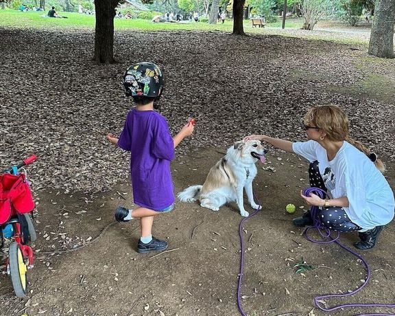 息子さんと一緒にアリソンのお散歩に。(pecoさんのInstagramより) -