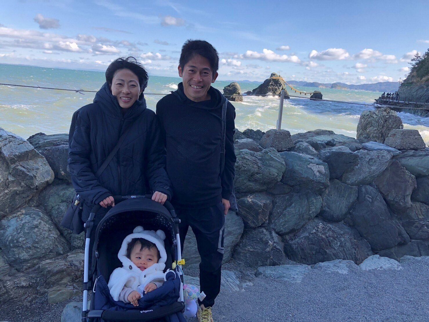 家族3人、夫婦岩前でパチリ。優輝さんの遠征先に家族も一緒に行くことも多いそう。 -