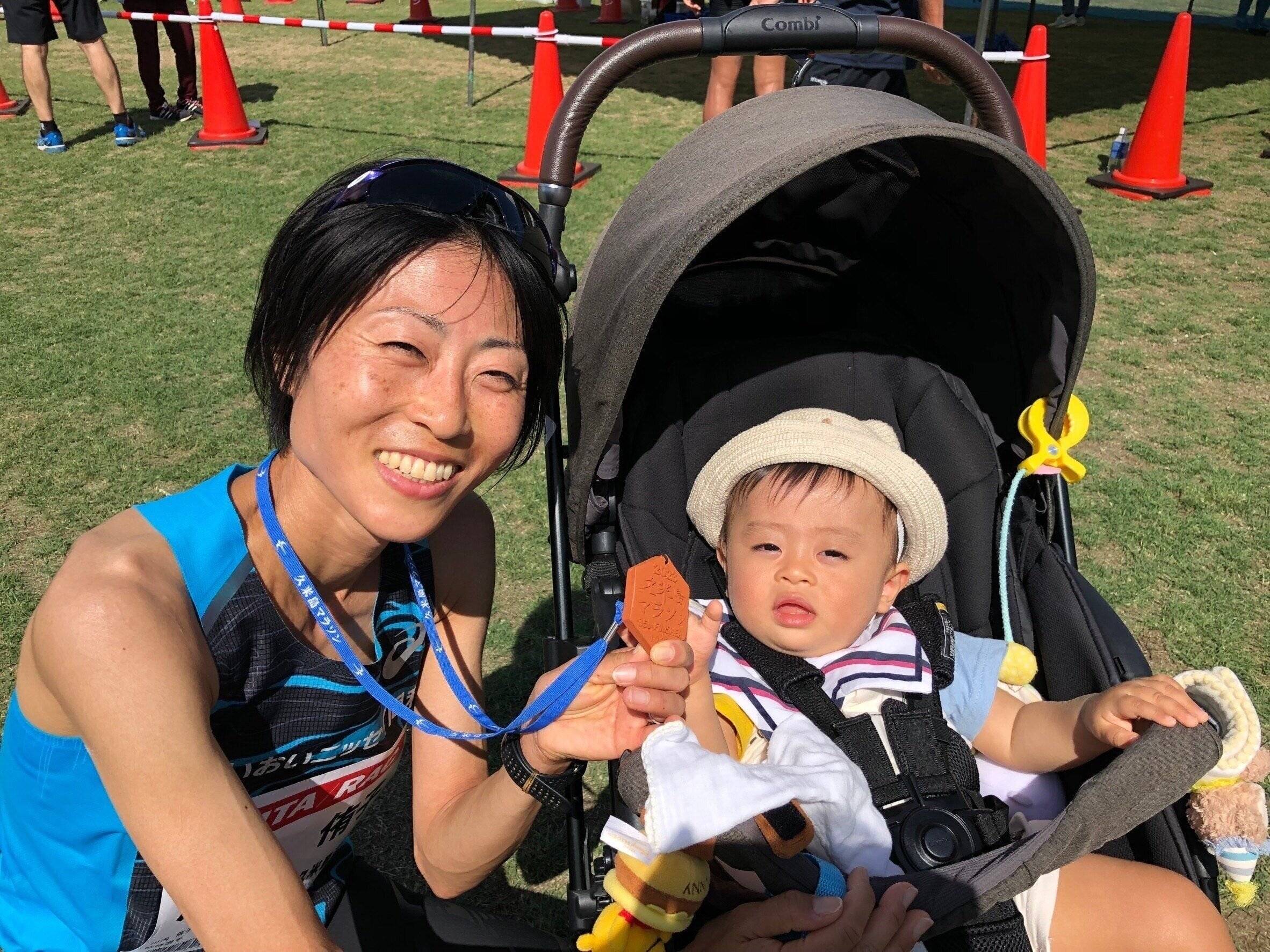2023年10月に開催された「久米島ハーフマラソン」で出産後初のハーフマラソンに出場した侑子さん。渉夢くんが見守る中、女子の部トップでゴール! -