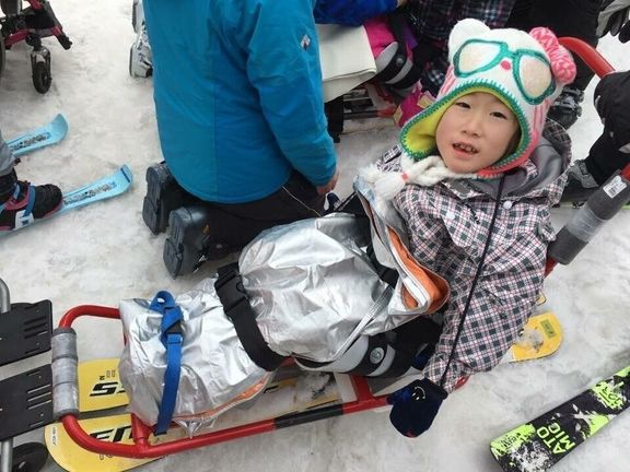 バイスキーに挑戦した9歳のとき。真心さんは終始怖がり、滑り終わった後も「やらなーい」と言っていたそう。 -