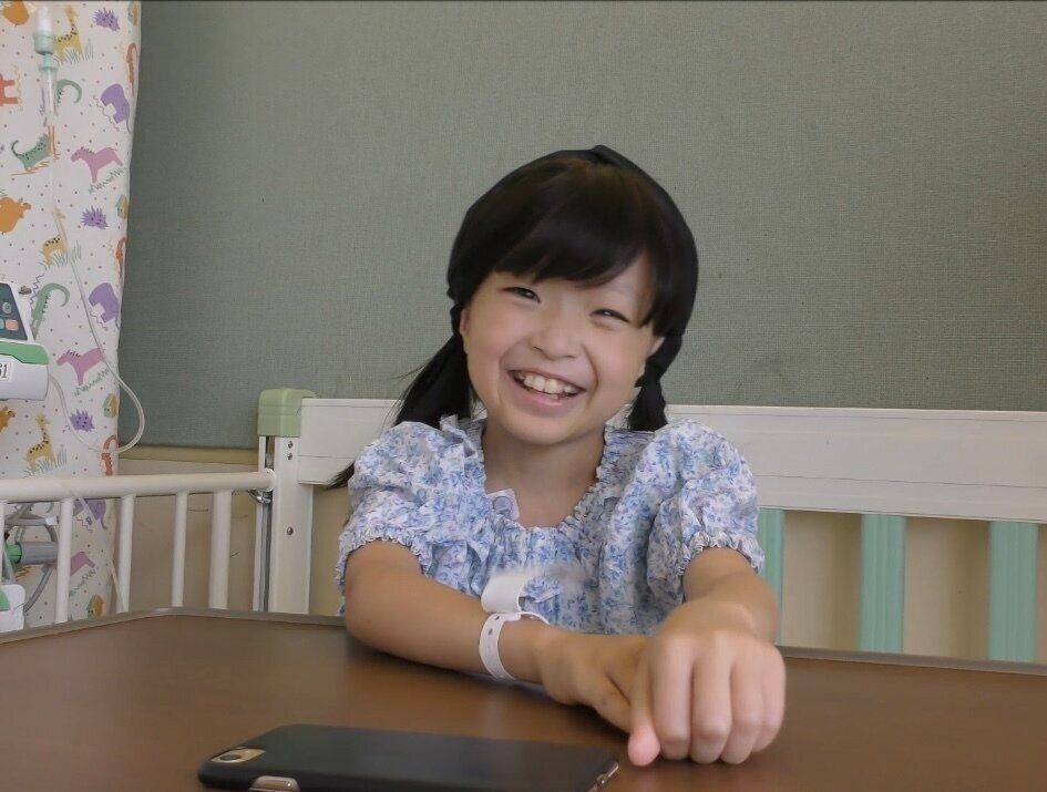 病室でのわかちゃん。9歳のとき。わかちゃんの笑顔は、みんなを元気にしてくれました。(写真提供/大西優子さん) -