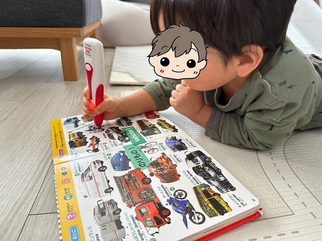 タッチペンを使って、乗り物の音を聞く二男の様子。 -