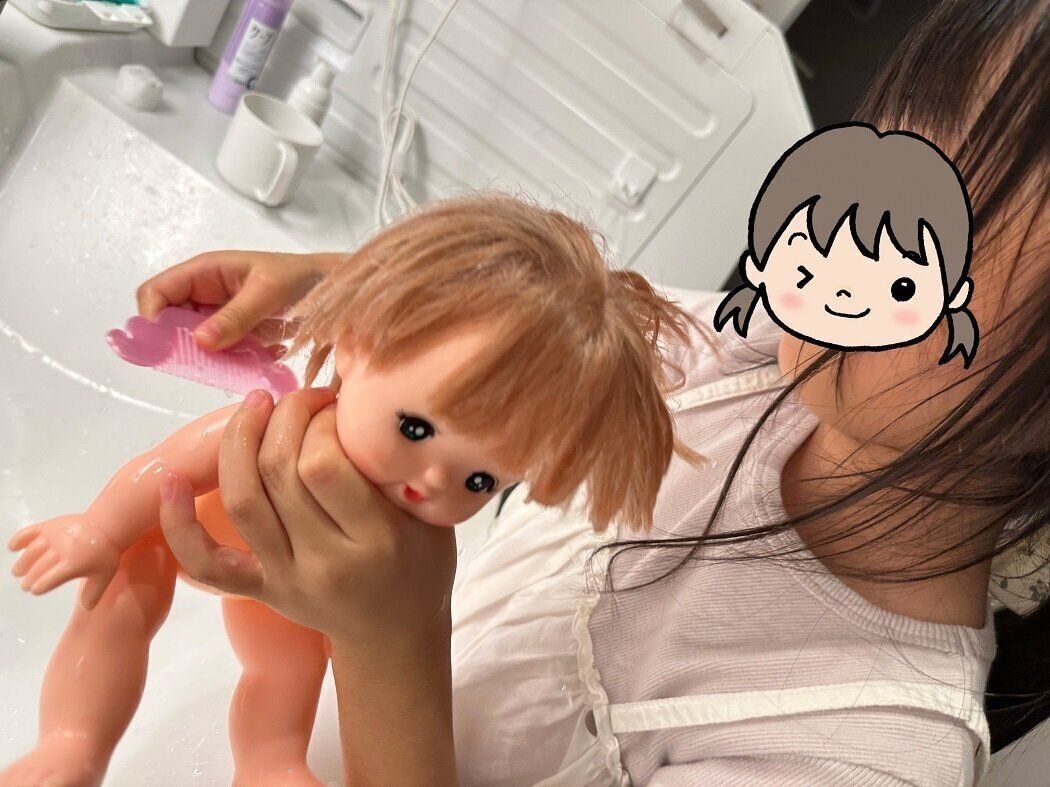 おふろに入れて、髪の毛を整えてあげている長女の様子。 -