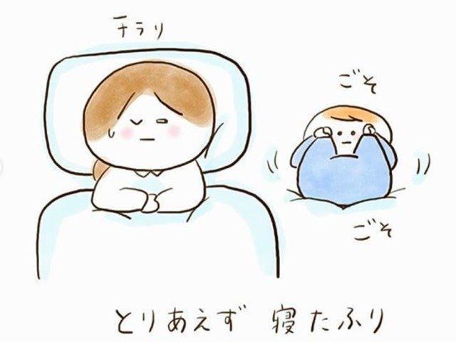 4. 朝起きてるけど寝たふり…癒し系あるある満載!ふゆだこん子さんの育児絵日記