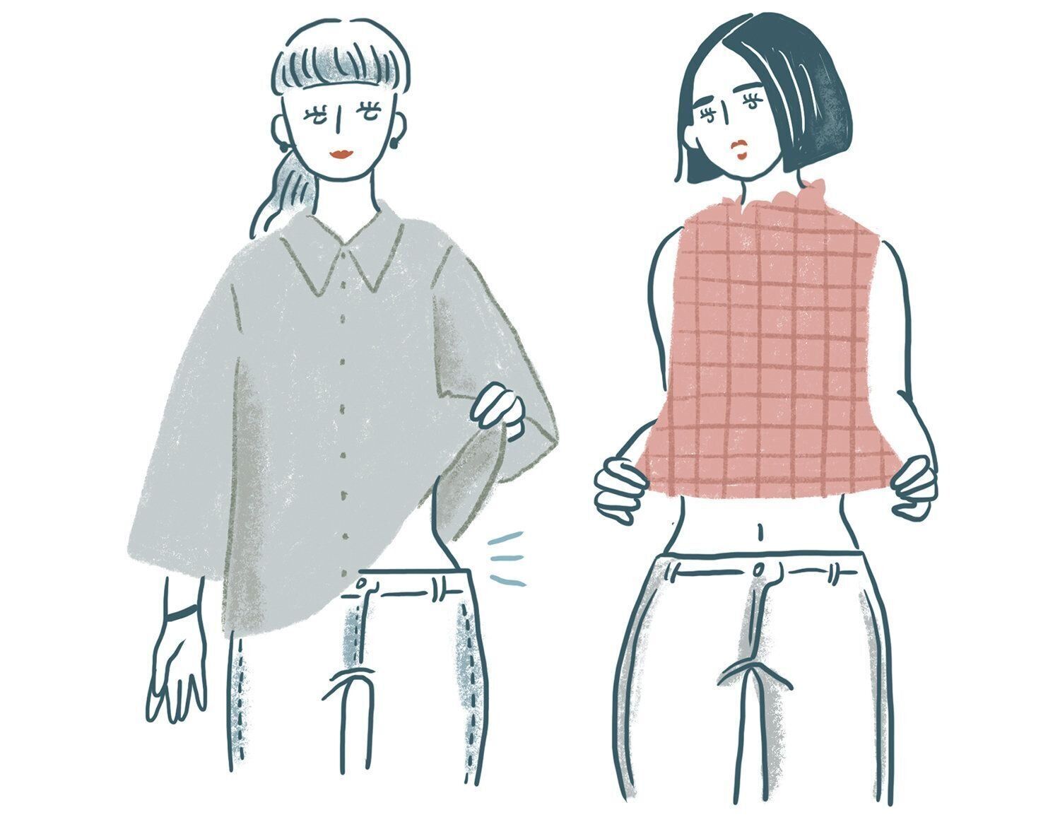 ローライズのボトムをはくなら、丈の長いトップスを着る、トップスはインするなどしておなかを外気にさらさないように。