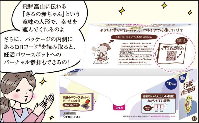 自宅で簡単! 約1 分から判定可能で99%以上の正確さを誇る「さるぼぼ妊娠検査薬(第2類医薬品)」。「排卵日予測検査薬(第1類医薬品)」と同様に、商品パッケージ内側のQRコード®を読み取ると、さるぼぼと一緒にバーチャル参拝ができます。