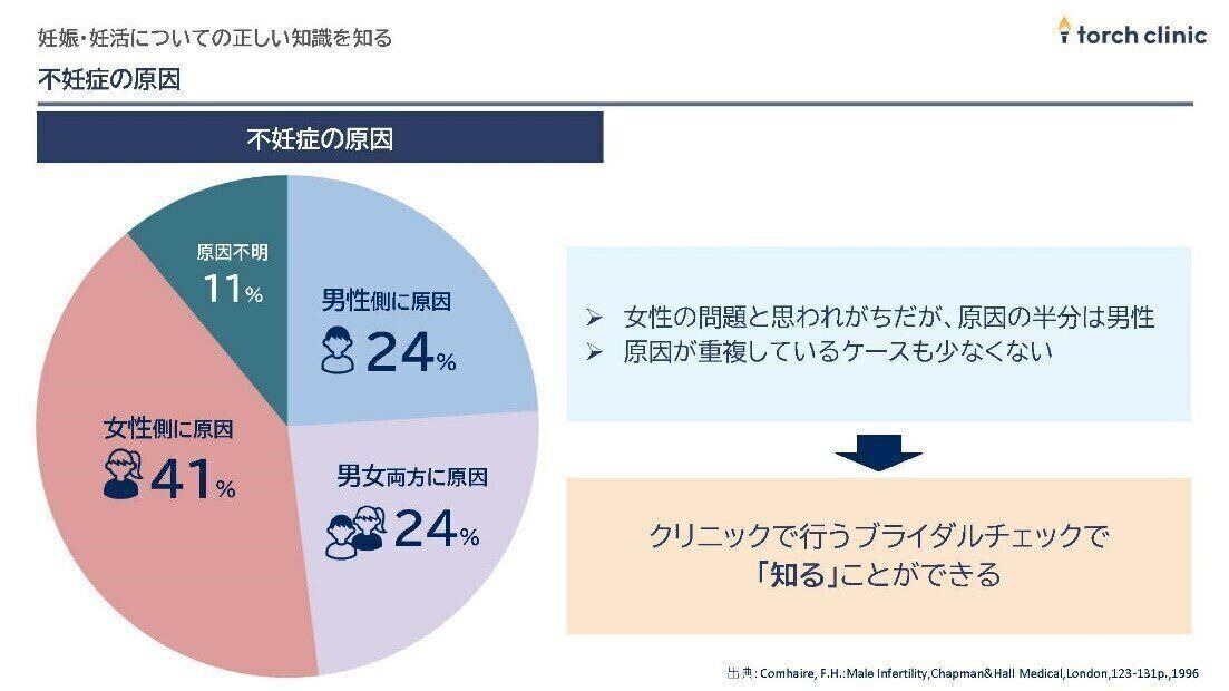 不妊治療と聞くと、どうしても女性側の問題だと思われがちですが、「男性にも原因があることが多いのです」と先生。このデータを見てわかる通り、男性側に原因がある確率が24%、男女両方に原因がある確率が24%、つまり48%の確率で男性側に原因があることがわかります。そこで、クリニックでのブライダルチェックで自分自身の身体を知ることが大切になってきます。