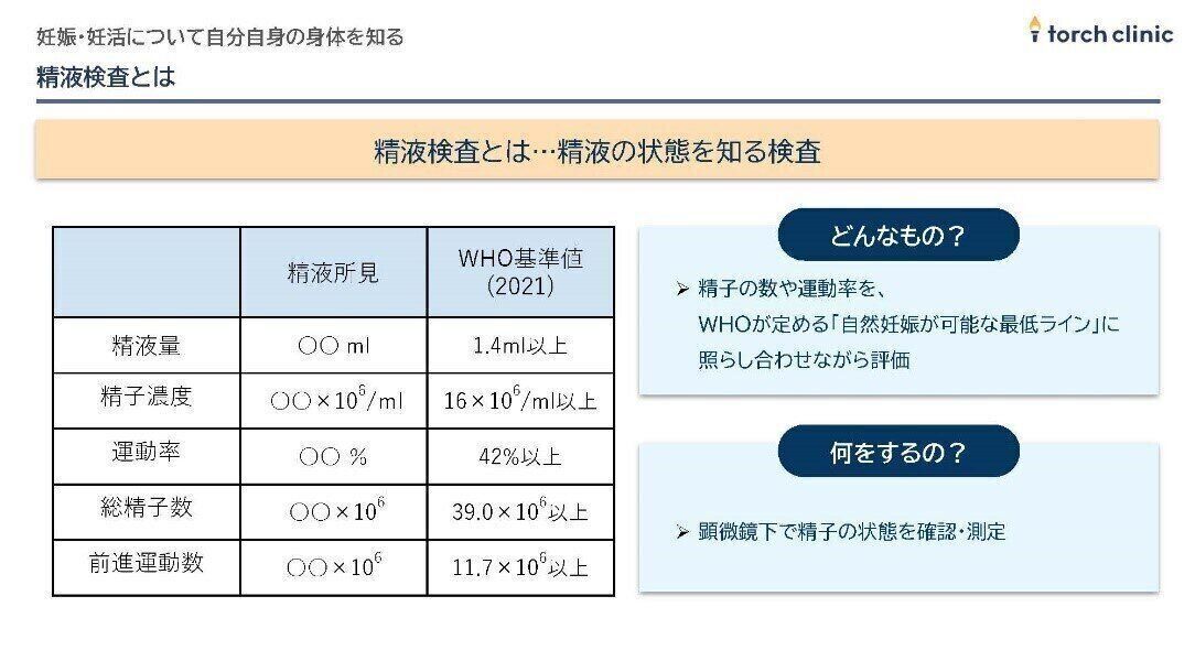 一方、男性側は精液検査、クラミジア抗体検査などを行います。精液検査とは自宅で自己採精をして精液の状態を測るものです。乏精子症や無力精子症などコンデションが悪い場合も多く、実は100人に1人の割合で無精子症の方も見つかるのだそうです。