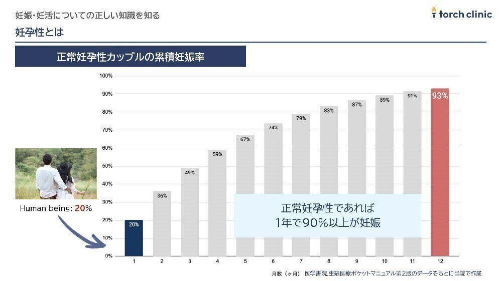ウサギの妊娠率は90%、ヒヒの妊娠率は80%、そしてヒトの妊娠率は20%と断然下がるのだそうです。これは健康な男女の数値で、能(妊娠のしやすさや能力)と呼ばれ、年齢とともに低下し回復しません。1カ月で20%の確率で1年間性交渉を続けると93%の確率で妊娠しますが、逆に妊娠できない場合は「不妊」の可能性があります。