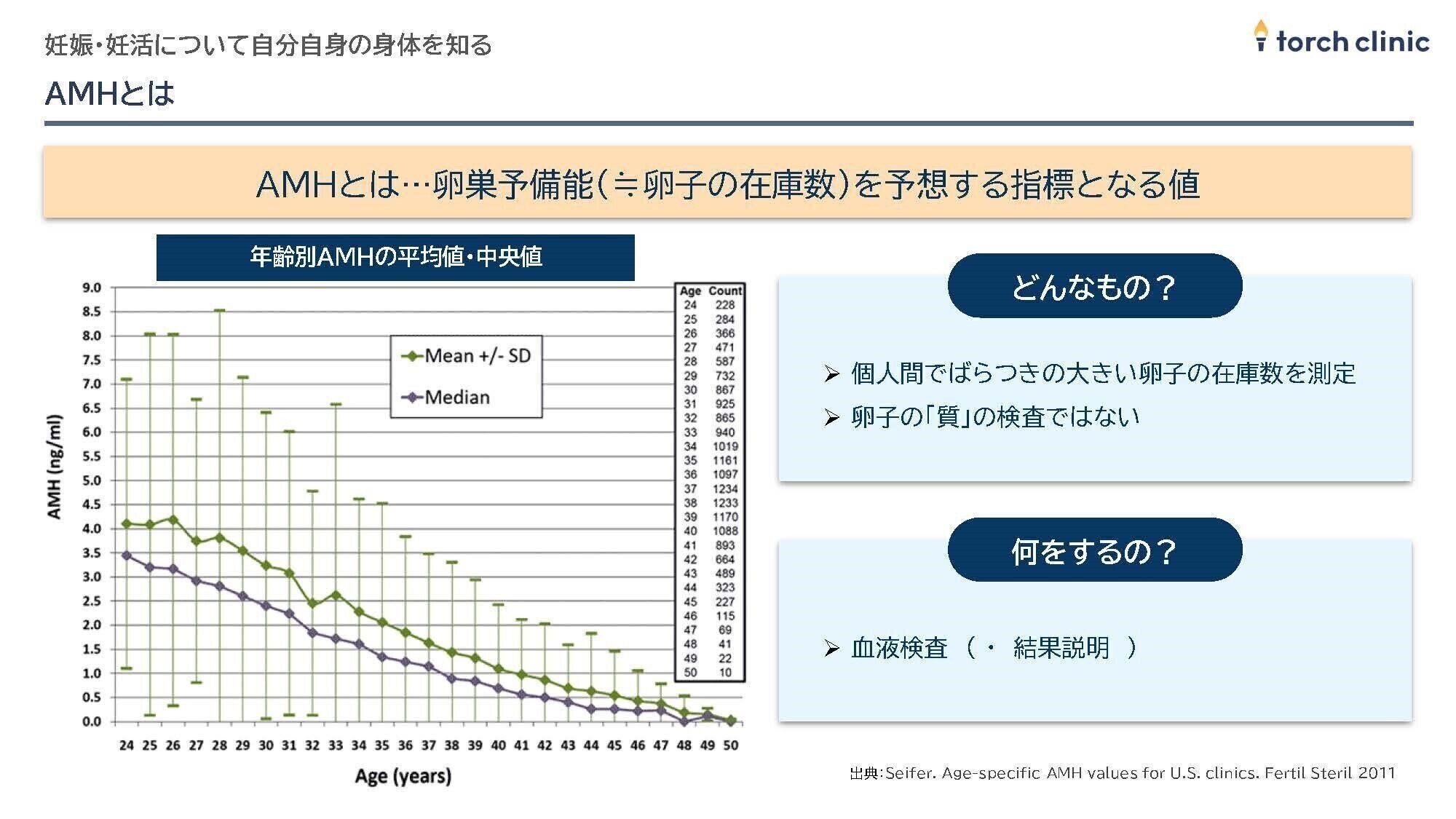 「ブライダルチェックとは“妊活版健康診断”のようなもので、未婚既婚・パートナーの有無関係なく受けることができます。そして受診することで不妊治療を強制されるものではありません」と先生。女性の場合、プランにもよりますがAMH(卵巣予備能・卵子の在庫数を予想する指標となる値)、女性ホルモン基礎値、クラミジア抗体検査などをチェックします。上のグラフはAMHの平均値ですが、女性は今ある卵子の在庫数を知ることができます。