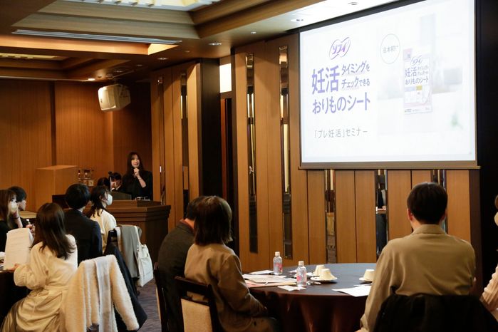 イベントの半ばでは、妊活で感じる負担を少しでも減らしたいという想いから開発されたユニ・チャーム「ソフィ 妊活タイミングをチェックできるおりものシート」の紹介も。おりものに反応し、妊娠の可能性が高い約6日間の間に分泌される「妊活おしらせ物質」を検出するとシートに判定サイン(二本線)が出ることで、妊活タイミングがわかるという画期的な商品です。また、生理管理アプリ「ソフィ」と連動することで「ソフィ妊活タイミングをチェックできるおりものシート」を使うタイミングが分かったり、妊活アドバイスを受けたりすることができるので、こういった便利なツールも活用してほしい、というアドバイスに皆さん熱心に耳を傾けていました。