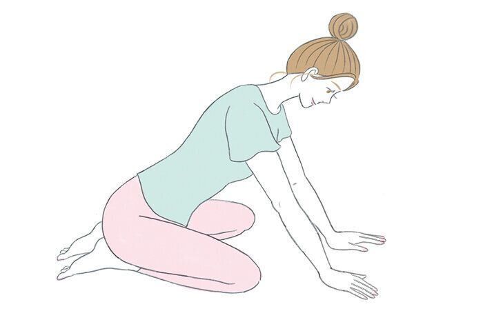 (1)四つんばいになり、両足の第一指(親指)と第一指を引き寄せ、ひざを軽く開いて、かかとの上にお尻をのせる。