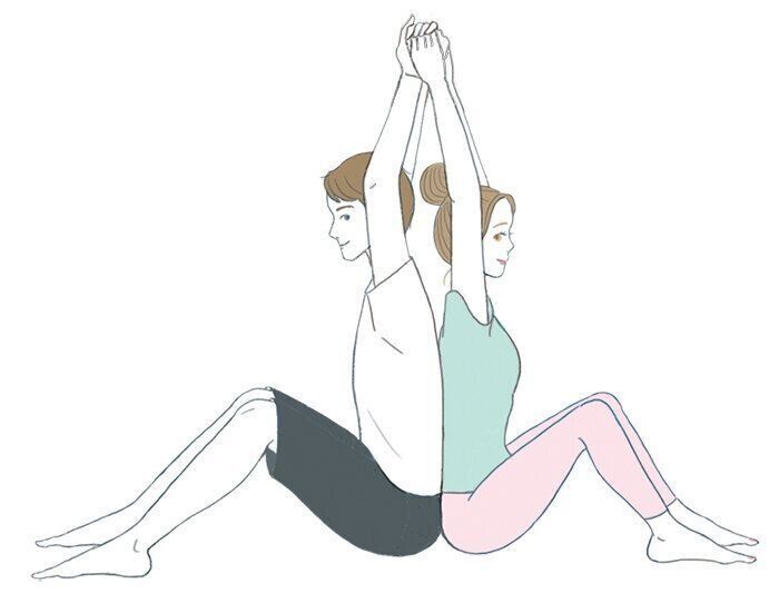 2人で手をつないで、ゆっくりと伸ばすことで、1人で行う以上にストレッチすることができます。肩から背中を伸ばすよう、意識して行うことで、血流も2人の仲のよさもアップ!