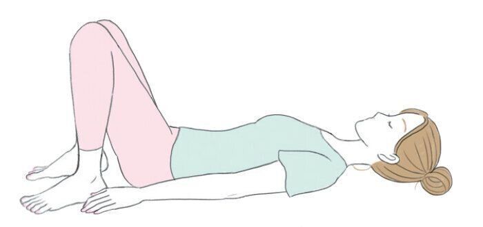 (1)仰向けに寝て、肩幅に開いた脚のひざを、右足、左足の順に立て、輪っか型に組んだ両手をウエストの下に入れて、手のひらを床につける。