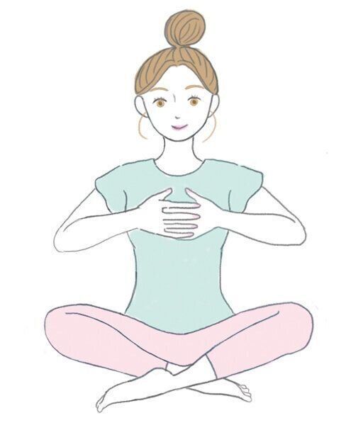 (1)床にあぐらをかき、両手を胸の前で組み、手のひらを自分のほうに向ける。
