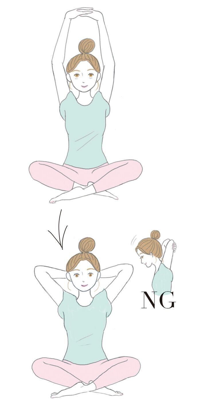 (2)そのまま両手を頭上に上げ、手のひらを下に向ける。