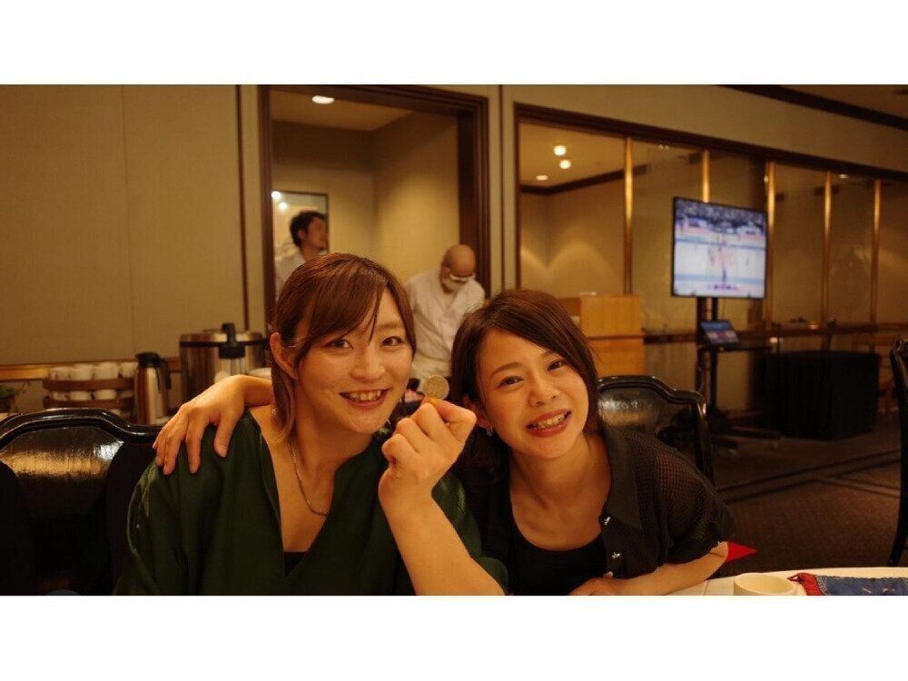 アスリート仲間の髙木菜那さんと。バレーボールの試合のコイントス(試合開始前に先にサーブを打つか、コートを選ぶかを決めるためのもの)でコインを投げることになり、その練習につきあってもらいました