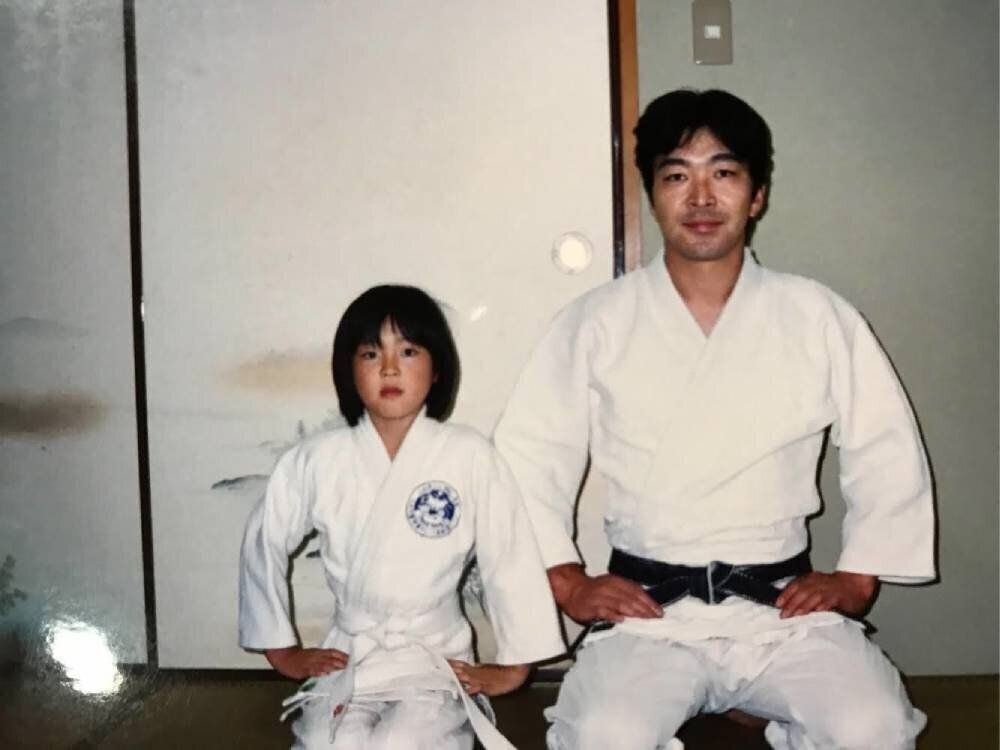 柔道を始めたころの角田さん(小学2年生のとき)とお父さん。「柔道というものをあまり詳しくなかったですが、道着を着ると背筋が伸びたのを覚えてます」