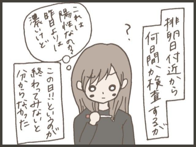 陽性と思ったら次の日もっと色が濃くなったりして、初回は自分がちゃんと排卵しているのかと、線の色がどれくらいの濃さになれば陽性なのかを確認するぐらいで終わりました。