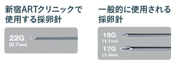 ■阿部先生「太い注射針は短時間に多くの卵子を含む卵胞液を吸引できますが、太さに伴って痛みも増幅します。その痛みを極力抑えるため、従来の2分の1サイズの細い採卵針を使用。針の先端部分に特殊加工を施しているので、痛みや出血も軽減します。これにより全身麻酔の必要もなく、採卵終了後、約15分間安静にしたら、帰宅が可能です」