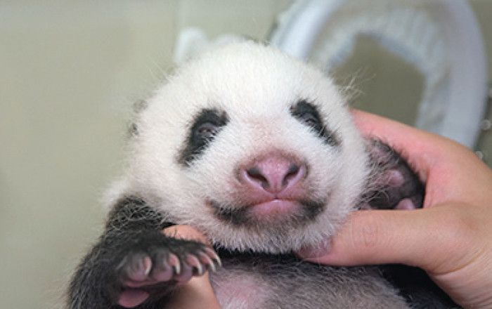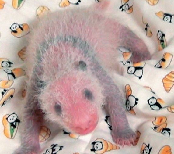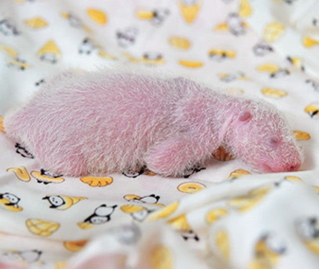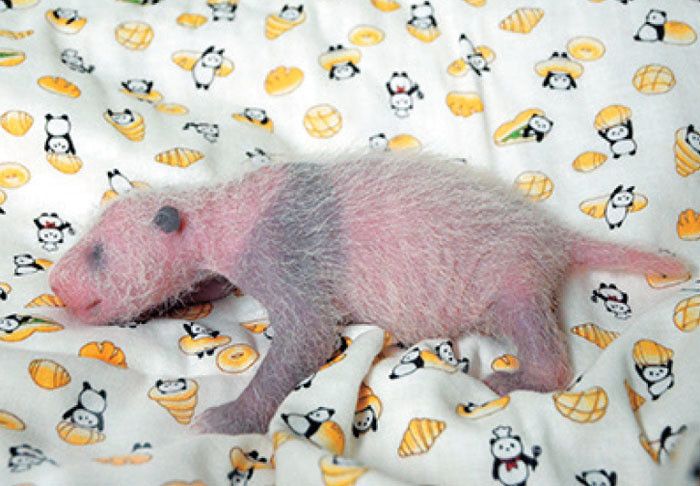 生後10日目、身体測定をしたときのシャンシャン。全体的にピンク色で、まだパンダらしさはあまり感じられません。