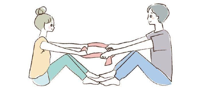 (2) お互いにタオルを引っ張り合いながら体を丸めて5秒キープ。男性は下腹部を、女性は子宮を覗き込むように。(1)〜(2)を数回繰り返す