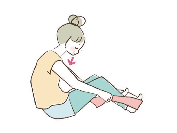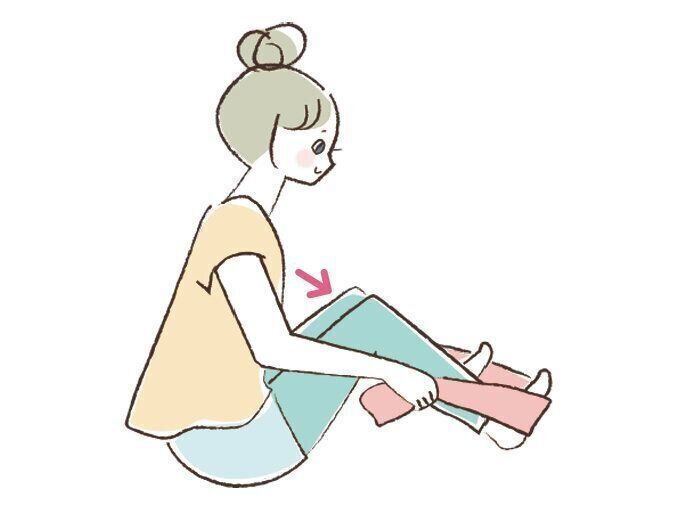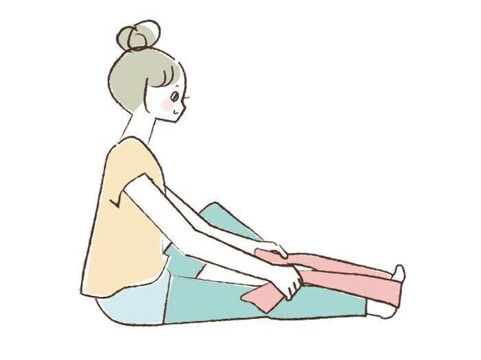 (2) そのまま上半身を太ももに近づけるよう前に傾ける。背中が丸まらないように注意して